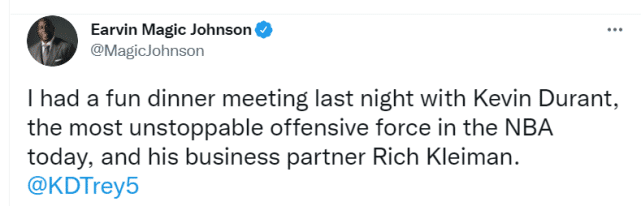 魔术师在自己和杜兰特的合影下配文写道:“昨晚,我和凯文-杜兰特以及他的商业伙伴里奇-克莱曼一起愉快地共进晚餐。他(杜兰特)是当今NBA最无法阻挡的进攻火力点,”