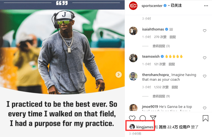 来源:24直播网09-21 16:1024直播网9月21日讯 ,湖人巨星詹姆斯前不久更新社交平台,点赞并转发了NFL名人堂球员迪昂桑德斯的采访言论:我训练是为了成为历史最佳球员,所以每当我走上那块球场,我都是带有目的去完成训练。