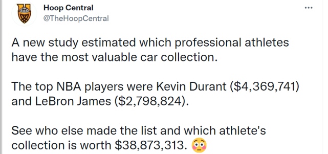 NBA球星豪车价值榜出炉!杜兰特436万居首,詹姆斯279万排名第二