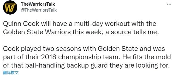 来源:24直播网09-19 10:5624直播网9月19日讯 ,据美媒体The WarriorTalk报道,奎因-库克将在本周和勇士队一起训练多日,库克曾为金州勇士队效力了两个赛季,是勇士2018年冠军球队的一员;该美媒还表示:库克符合勇士正在寻找的控球后卫。