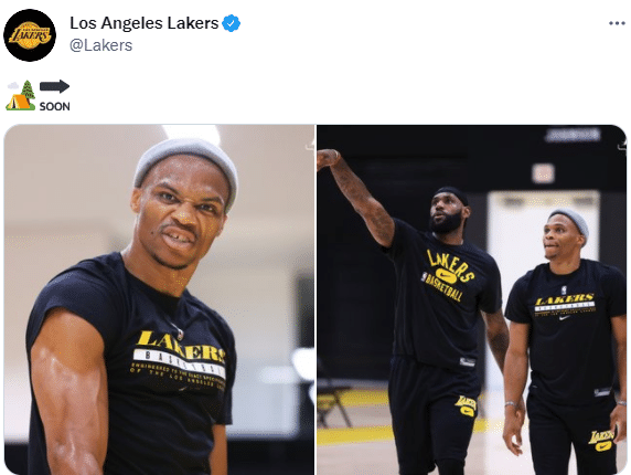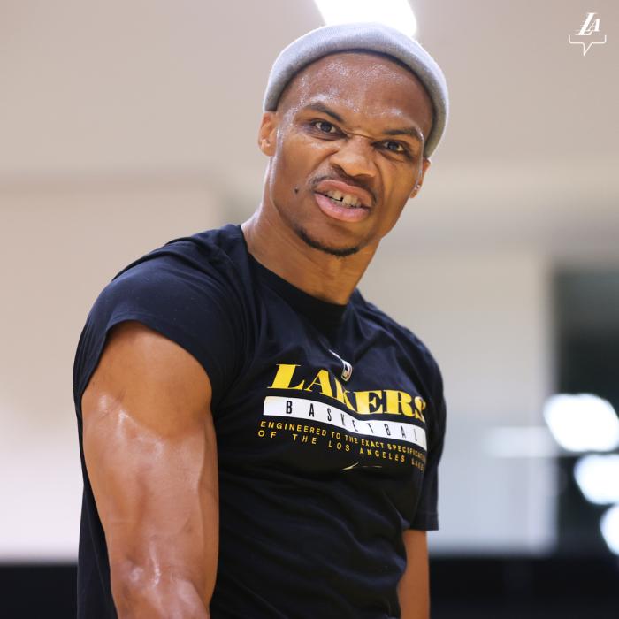 湖人两大巨头再次合练,威少依旧戴着灰色绒帽,冲着镜头露出发狠表情;詹姆斯和威少都身穿湖人训练服,今年休赛期,他俩走得特别近。