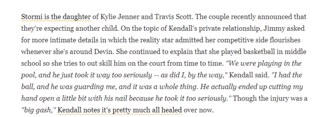 主持人知道詹娜中学也打过篮球,就问她:“你们俩会不会打一些一对一的比赛?”詹娜回答道:“我们确实有时候会打,我们和朋友一起在泳池里打过篮球。他真的太认真了,顺便说一下,我也很认真。”主持人插话道:“在你头上扣篮了吗?”詹娜接着说:“我拿着球,他防守我,结果他的指甲把我的手划了一条大口子。现在基本好了,但那个伤口困扰了我大概两周。”观众们一片哄笑。