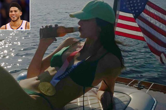 主持人说:“布克在太阳队打球,他很棒,刚刚赢下一枚金牌!”詹娜笑着回应:“是的,他做到了!很棒!”观众一片欢呼声,看来又吃了不少狗粮。詹娜此前在社媒上也曾晒出自己戴着金牌的照片。
