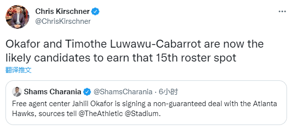 据NBA记者ChrisKirschner补充报道,奥卡福将和蒂莫泰-卢瓦乌-卡巴罗竞争老鹰的第15人,此前卡巴罗也和老鹰签下了一份无保障合同;奥卡福曾在17-18赛季为篮网出战26场比赛,今年被活塞交易后,篮网直接把他裁掉。