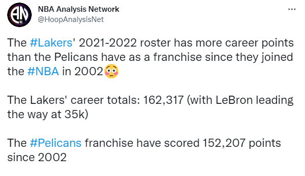 来源:24直播网09-17 15:2124直播网9月17日讯,美媒晒出一项疯狂的数据,湖人21-22赛季所有球员总得分加起来,总和是162317分,超过鹈鹕队史总得分,多出10000多分。