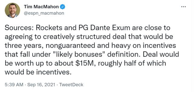 来源:24直播网09-16 11:0524直播网9月16日讯 ,据名记Tim MacMahon报道,消息人士透露,火箭与埃克萨姆接近达成一份3年1500万美元的无保障合同。这份合同很特别,三年无保障,总金额近一半为非常可能得到的奖金,因此,当埃克萨姆被交易时,奖金可以被计入工资。这些奖金将主要基于他的平均上场时间及比赛正负值。