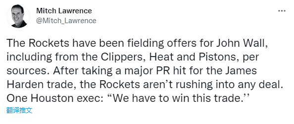 据美记Mitch Lawrence报道,火箭已经收到快船、热火以及活塞关于沃尔的报价,不过由于对哈登交易的最终结果不理想,目前火箭十分谨慎,不着急达成任何交易;一名火箭高层表示:球队要在沃尔交易中成为赢家。