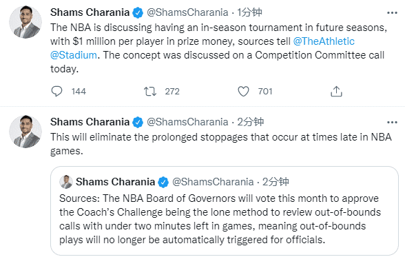 由于疫情的原因,19-20和20-21赛季都是缩水赛季,针对这种情况,联盟举办了争夺季后赛名额的附加赛;由于上赛季附加赛颇具外界关注,尤其是湖人和勇士一场定胜负,争夺季后赛名额;新赛季联盟恢复常规赛82场,仍旧举办附加赛;现在联盟又想在赛季中期举办杯赛。