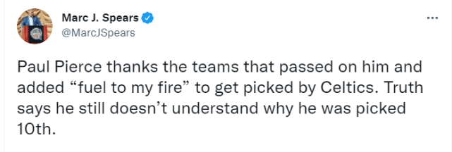 皮尔斯表示自己还是个孩子时,只想能打进NBA,没想到最终成为了名人堂的一员。提到这儿,皮尔斯不忘调侃一下:“名人堂做出了正确的选择。”感谢了自己一路走来的教练和队友,他甚至感谢了1998年选秀大会上9支没有选择自己的球队:快船、灰熊、掘金、猛龙、勇士、独行侠、国王、76人、雄鹿。皮尔斯一连串念出这些队名,因为他对能加盟绿军充满感恩,当然他也表示不理解自己为什么到第10顺位才被选中。他还提到了雷-阿伦,引来的大家的欢呼,他俩已经彻底冰释前嫌。