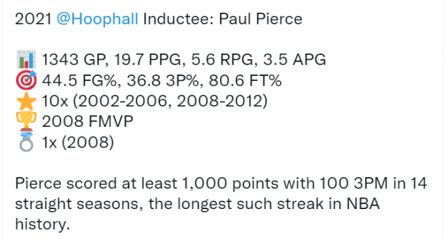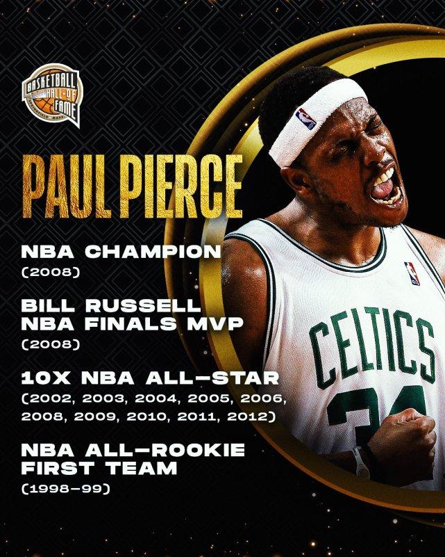 入选名人堂,在皮尔斯看来,就是他篮球生涯这本书的“最后章节”。对于他来说,这本书的核心,是为绿军奋战的时光。皮尔斯在NBA打了19个赛季,其中15个赛季效力于凯尔特人。10次入选全明星,4次入选最佳阵容,帮助球队在2008年夺得总冠军,他本人也当选总决赛MVP。2018年2月份,凯尔特人退役了他的34号球衣。
