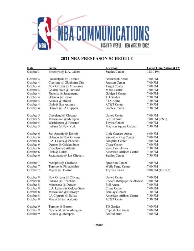 来源:24直播网09-11 09:5224直播网9月11日讯 ,NBA官方公布了2021-22赛季的季前赛赛程。季前赛将于10月4日(北京时间,下同)开打,一直持续到10月16日,前后共13天66场比赛。