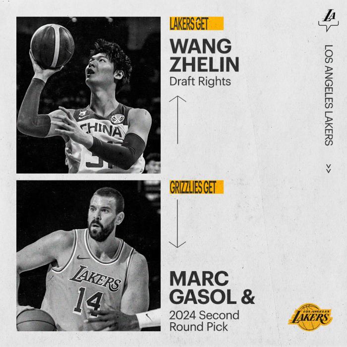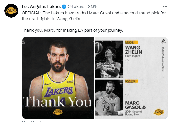 湖人官方宣布:湖人已经把小加索尔和一个二轮选秀权交易到灰熊,从而得到王哲林的签约权;谢谢你,马克,让湖人队成为你生涯的一部分;湖人官方还晒出小加身穿湖人球衣照,表达谢意,并且晒出这笔交易的具体细节。
