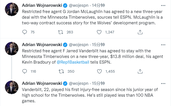 来源:24直播网09-11 09:3424直播网9月11日讯 ,据espn名记沃纳罗斯基报道,森林狼连续签约两名球员,3年1380万美元续约范德比尔特,3年650万美元续约麦克劳林,双向合同球员终于获得正式合同。
