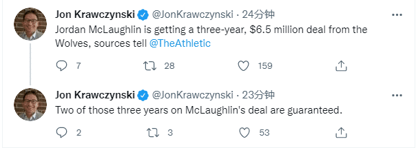 25岁的乔丹-麦克劳林和森林狼新签3年650万美元合同。