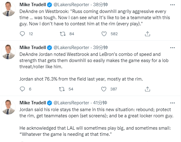 谈到威少时,小乔丹表示:威少的比赛极具强度和侵略性,他每次都带着‘愤怒’进攻,以后我不用再与他竞争了;小乔丹还表示:浓眉是一位非常有天赋和全面的球员,勒布朗打球非常无私,很高兴来到这支有实力竞争总冠军的球队。