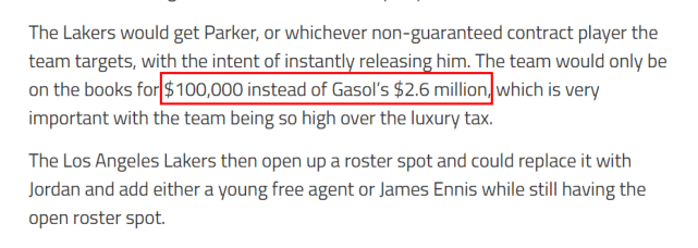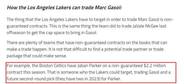 NBA不少球队有非保障合同,lakeshowlife以凯尔特人的贾巴里-帕克为例。湖人可以用小加索尔和一个次轮签(2023年湖人拥有两个次轮签),去换来昔日的榜眼帕克(220万非保障合同)。他们认为凯尔特人会乐意接受这个方案,因为他们需要中锋的深度,而且小加可以指点年轻的罗伯特-威廉姆斯。