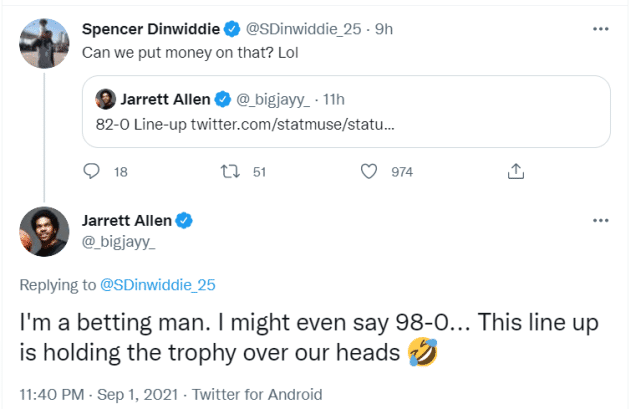 阿伦在社媒上先是转发了Statmuse的阵容,点评道:“82胜0负的阵容。”阿伦的言论引起热议,不少球迷都参与讨论,就连阿伦在篮网的前队友丁威迪也来凑热闹。