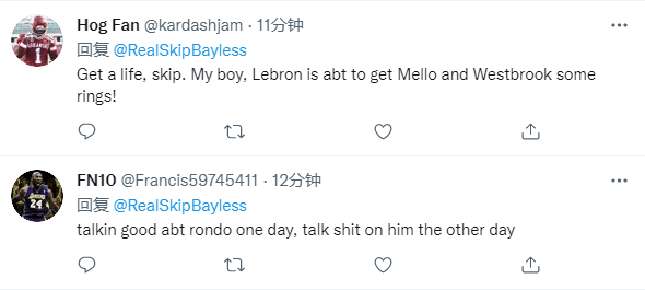 斯基普-贝勒斯如此言论引热议,有球迷直言斯基普,我的孩子去生活吧,勒布朗有能力让威少和安东尼夺冠的;还有球迷说斯基普一天对朗多说好话,又对他说废话,嘲讽斯基普是墙头草;更有球迷晒出昔日朗多怒瞪小卡的画面:像这样发生冲突吗?