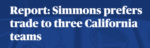Keith Pompey关于西蒙斯的报道中提到,某西部高管认为西蒙斯想去加州球队打球。“三个月之前,我们只听到76人想要交易西蒙斯,而现在跟三个月之前的区别是西蒙斯也不想再为76人效力了。他想要去某三支加州的球队,他和76人之间的关系很糟糕。”NBA在加州目前有四支球队,包括湖人、快船、勇士和国王。