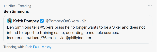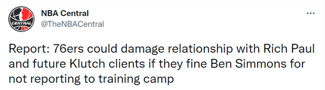 另据记者Brad Sullivan透露,如果76人因为西蒙斯拒绝前往训练营报到而对他进行罚款,将会导致他们和西蒙斯经纪人里奇-保罗的关系破裂。据悉,里奇-保罗旗下的球员中有76人想要签约的自由球员。有报道称,里奇-保罗希望泰雷斯-马克西与西蒙斯能够一起离开76人。