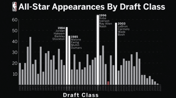历年选秀全明星总次数统计!科比领衔96届第一!詹姆斯守护03届荣光