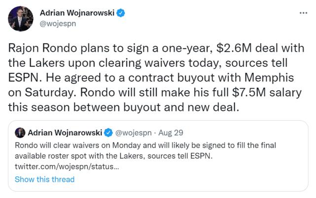 据名记Woj报道,隆多度过澄清期后计划一年260万签约湖人。隆多在当地时间周六和灰熊达成买断,他预计在当地时间这周二与湖人正式签约,算上灰熊的买断费本赛季他仍能拿到750万薪水!兜兜转转一圈还是回来了,帮湖人夺冠后他与老鹰签下2年1500万的合同,又短暂效力快船,但都没起到在湖人时期的作用!
