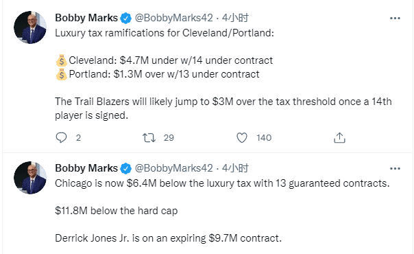 小南斯场均可以得到9.3分6.7篮板,合同还剩下两年,分别是1070万美元和960万美元;小琼斯场均得到6.8分3.5篮板,年薪是970万美元,通过这笔交易之后,公牛有13名球员拥有正式合同,低于奢侈税640万美元;骑士离奢侈税还差470万美元,开拓者13名正式球员已经超过奢侈税线130万美元。