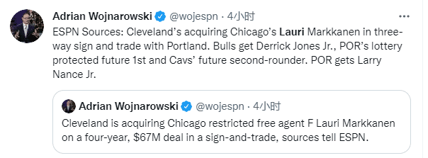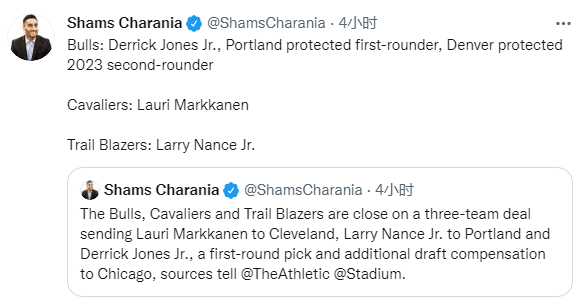 公牛送出马尔卡宁得到小德里克-琼斯,波特兰2022年受保护(1-14顺位保护)的首轮签以及掘金受保护的2023年次轮签(骑士送出)