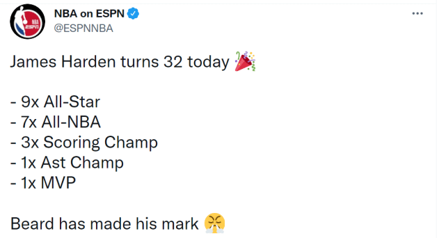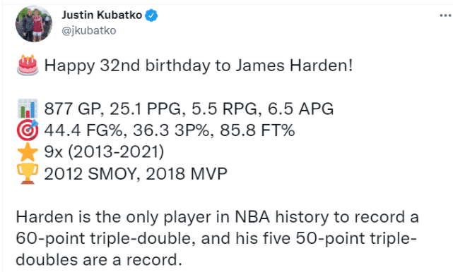 ESPN写道:“哈登今天32岁了,9届全明星,7次入选最佳阵容,3次得分王,1次助攻王,1次MVP……”数据专家Kubatko也在祝福哈登生日快乐,并列出了哈登的数据:“877场比赛,25.1分5.5篮板6.5助攻,投篮命中率44.4%,三分命中率36.3%,罚球命中率85.8%。9次全明星,2012年的最佳第六人,2018年的MVP。哈登是NBA历史上唯一一位拿到过得分60+三双的球员,他的5次50+三双也是一项纪录。”
