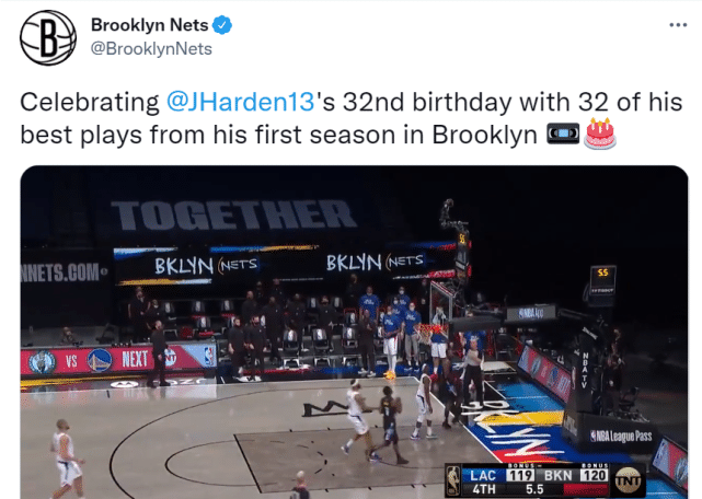 篮网官方也相当用心,他们还剪辑了哈登效力篮网第一个赛季的32个最佳赛场表现,来庆祝他的32岁生日。