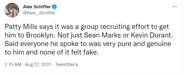 不少人认为,米尔斯决定加盟篮网,是因为杜兰特的招募,但事实上并不是那么简单。“那是一个团队招募的结果,不只是肖恩-马克斯(篮网总经理)或者凯文-杜兰特,每一个我聊过的人都很纯粹和真诚,”米尔斯说道,“没有什么让他觉得很假。”