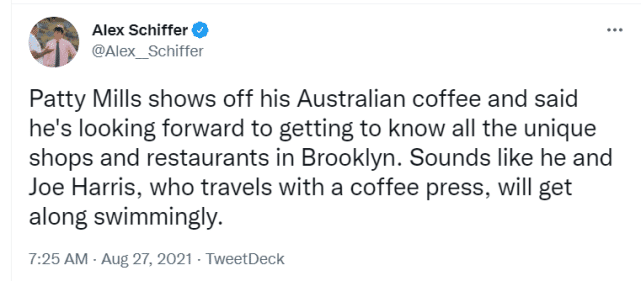 米尔斯也对布鲁克林的文化充满期待,他希望逛遍当地特色的商店和咖啡馆。他还向记者们展示了自己的澳洲咖啡。篮网记者猜测,深受马刺咖啡文化影响的米尔斯,应该会和哈里斯很有共同话题,因为哈里斯也是个咖啡控,去客场打球都得带着一台咖啡机。