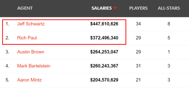 如果以新赛季球员的年薪总和作为排名标准,里奇-保罗旗下目前签有29位NBA球员,其中5位是全明星球员。29位球员的2021-22赛季年薪总和是3.72亿美元,这一数字可以在经纪人业内排名第二位。一年前,同样是这份排名,里奇-保罗位居第三,当时他签约球员的总年薪是2.73亿美元。