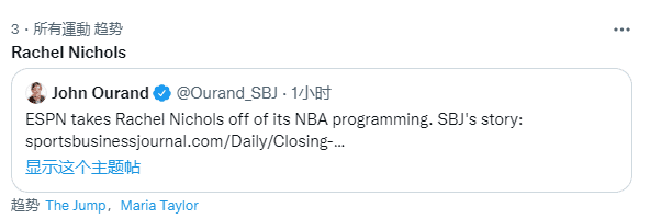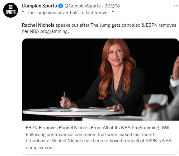 瑞秋-尼科尔斯发推告别ESPN,晒照并且发文:制作了一个完整的节目,花了五年时间和我最喜欢的人在一起谈论一件我最喜欢的事情(篮球,永远感谢我们了不起的制片人和剧组——《The Jump》从来都不是为了永远持续下去而设计的,但它确实很有趣。
