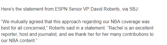 ESPN高级副总裁大卫-罗伯茨针对这件事发表声明:我们一致认为,对于我们的NBA报道,这种方法对所有相关方都是最好的;瑞秋是一名出色的记者和主持人,我们感谢她为我们的NBA内容做出的诸多贡献。
