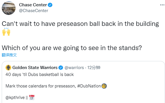 勇士官方发推:离篮球回归还有40天,标记好季前赛的日期;大通中心官推写道:迫不及待地想在主场球馆打季前赛,我们将在看台上看到你们中的哪一个?