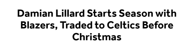利拉德并未正式申请交易,至少到目前为止,他的4年1.96亿美元的合同还在波特兰。不过,美媒认为他将在圣诞前被交易至凯尔特人。过程可能类似于哈登,上赛季,哈登只为火箭打了8场比赛,然后通过交易加盟篮网。