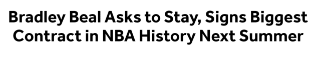 美媒预测比尔不会离开华盛顿,最终会要求长期留队,并在明年夏天签下一笔大合同。届时,比尔有望和球队签下一份5年2.35亿美元的合同,这将打破字母哥的5年2.28亿的纪录,成为NBA史上最大的合同。美媒认为76人、勇士、鹈鹕等球队都可以为比尔开出交易报价,但奇才恐怕很难被打动。