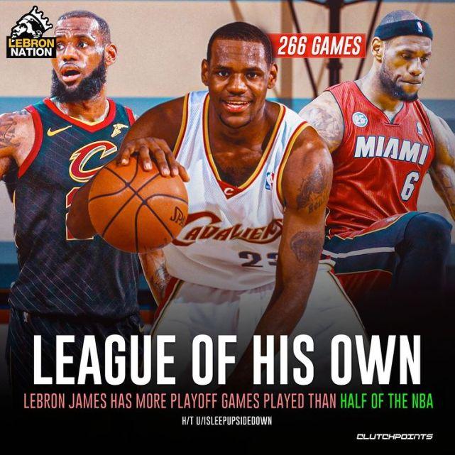 在季后赛的舞台上,他就是一棵常青树。clutchpoins还列出了另一项数据,詹姆斯生涯至今参加了266场季后赛,这个场数是什么概念?NBA有一半球队的队史季后赛数量都没有达到这个数。