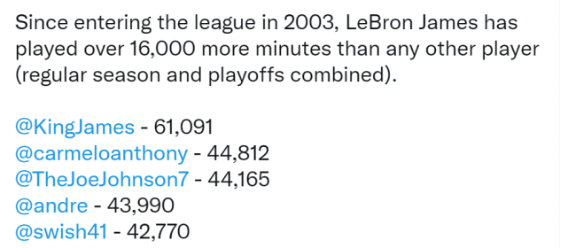 自从詹姆斯2003年进入联盟以来,他的常规赛+季后赛的总出场时间已经达到61091分钟,在这个时间段里,最接近他的是现在的队友安东尼。他打了44812分钟,还比詹姆斯少了16000多分钟。不比不知道,老詹确实是独一档的存在。