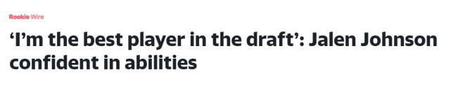 接受采访时,约翰逊说:“我知道我是这届新秀里最好的球员,我就是对自己这么有信心。我的父母也说了一样的话。他们让我坚定了信念。这并没有给我带来压力……”