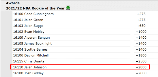 根据最新的年度最佳新秀赔率,杰伦-约翰逊只排在第10位,赔率是+2800。这一奖项的最大热门仍是活塞状元坎宁安和火箭榜眼格林,两人同为+275。毕竟,且不说实力,论队内的角色和地位,约翰逊还无法和他们俩相比。