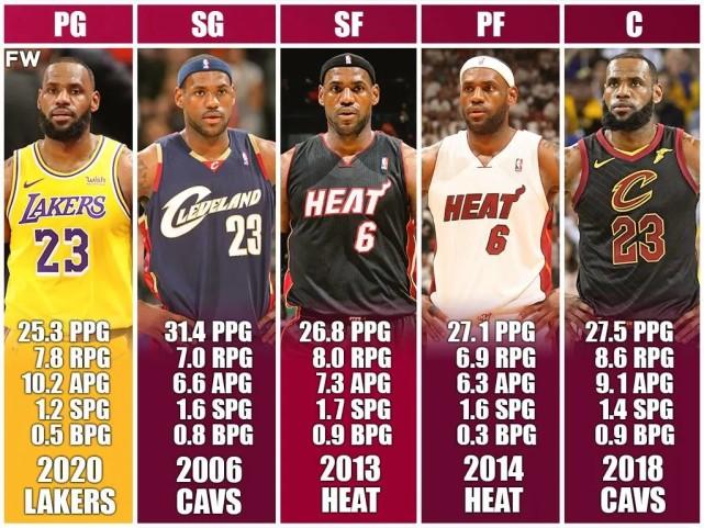 除了小前锋,詹姆斯还打了不少时间的大前锋。生涯至今,詹姆斯有26%的时间打大前,2013-14赛季是詹姆斯出现在大前锋位置时间占比最高的一年,达到83%。那一年的詹姆斯,场均能得到27.1分6.9篮板6.3助攻,三分命中率37.9%,美媒认为,这个赛季的詹姆斯可以成为一个非常优秀的大前锋:空间型的全能四号位。