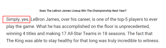 美媒认为,这样一套“詹姆斯首发”难以抵挡,完全可以拿下总冠军。能够一人出任五个位置,恰恰说明了詹姆斯最大的优点:全能。
