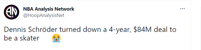 美媒转发施罗德的视频时,还调侃道:“施罗德拒绝了4年8400万的合同,成为了一名滑板青年。”看来,盲目的自信,要让施罗德损失不少钱了。
