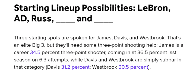 先来说说湖人的首发。威斯布鲁克、詹姆斯和浓眉已经锁定其中三个名额,悬念就在于余下的两个名额属于谁。达科尔指出,三巨头需要一些外线的帮助,毕竟,詹姆斯生涯三分命中率34.5%,浓眉31.2%,威少30.5%,都不算准。