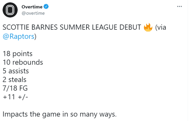 猛龙看中巴恩斯,就是欣赏他在攻防两端的全面,在夏联首秀上,巴恩斯也展现了自己的这一优势。猛龙的范弗利特、西亚卡姆、伯奇和特伦特等球员都来到拉斯维加斯,观看了巴恩斯的首秀,相信这位年轻人的表现能令这些老大哥感到满意。