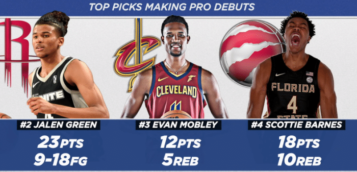 NBA四大新秀都已完成夏联首秀,状元坎宁安12分6篮板5失误表现不佳,火箭榜眼杰伦-格林18投9中、三分9中4轰下23分5篮板2助攻,惊艳全场;骑士探花莫布里17投6中拿到12分5篮板3盖帽 ;猛龙4号秀巴恩斯首秀18分10篮板5助攻2抢断1盖帽十分全能。