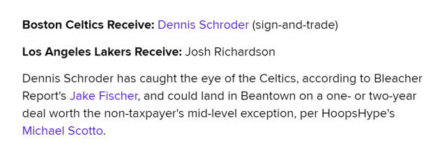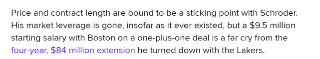 现在来看, 凯尔特人可能最多为施罗德提供一份年薪是950万美元的1+1短约。如果施罗德接受这一合同,他应该会后悔上赛季拒绝了湖人4年8400万美元的报价。