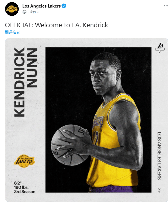 蒙克也正式签约湖人,新赛季他将穿湖人11号球衣。
